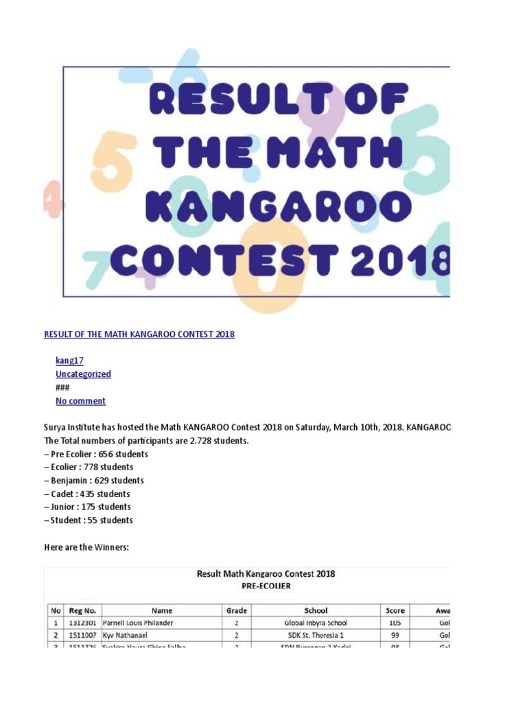 The kangaroo math competition is one of the biggest competitions in more than 70 countries around the world attended by about 6 million students. Congratulations to all of the participants and winner of the kangaroo math completion. Math kangaroo 2019 winners math kangaroo is an international competition. News from mathnasium of acton concord. The contest originated from france and is.